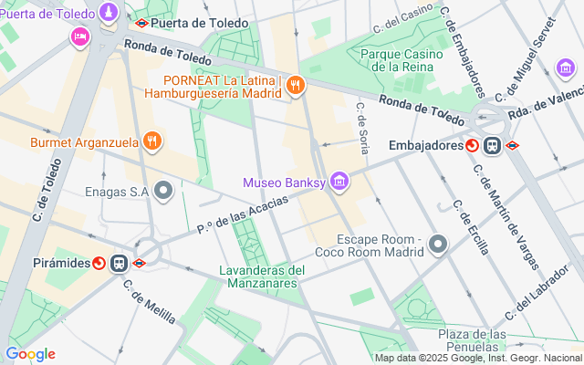 Metro y Cercanías: estaciones de Acacias, Embajadores y Pirámides a escasos minutos a pie.